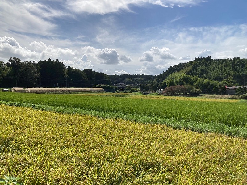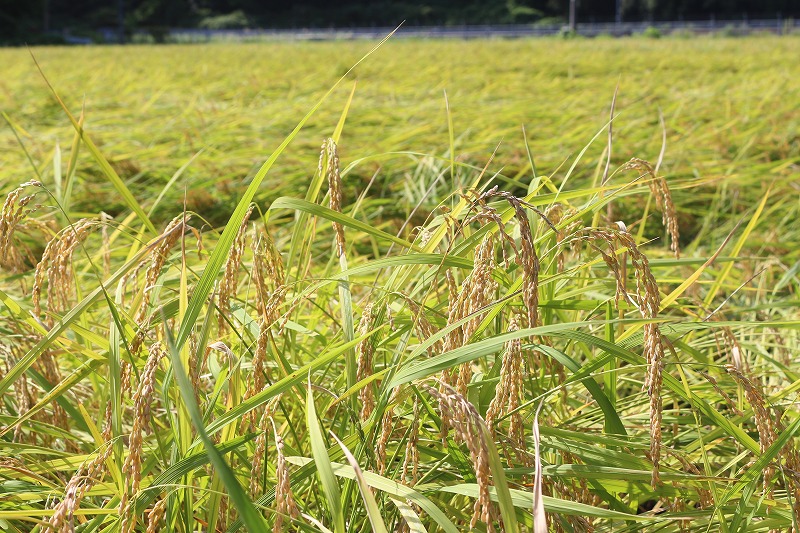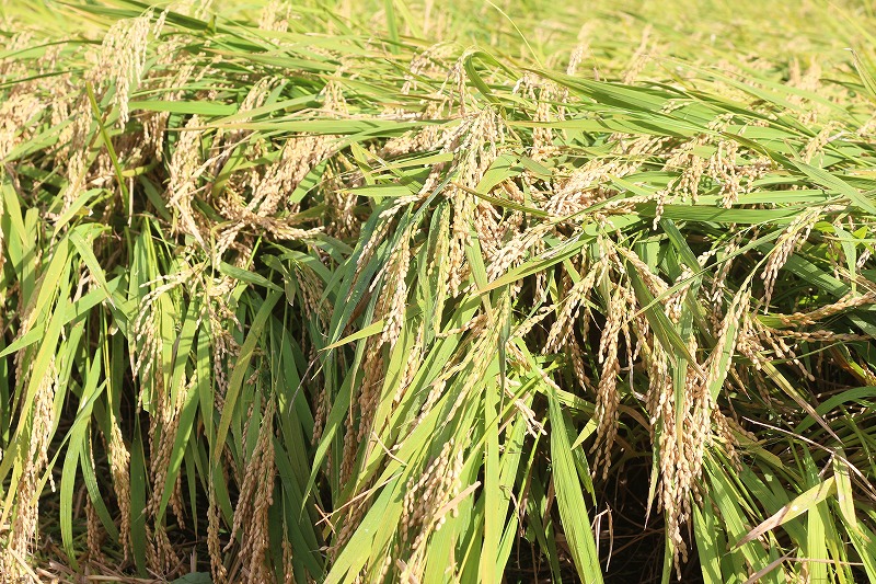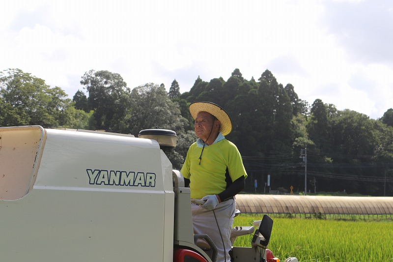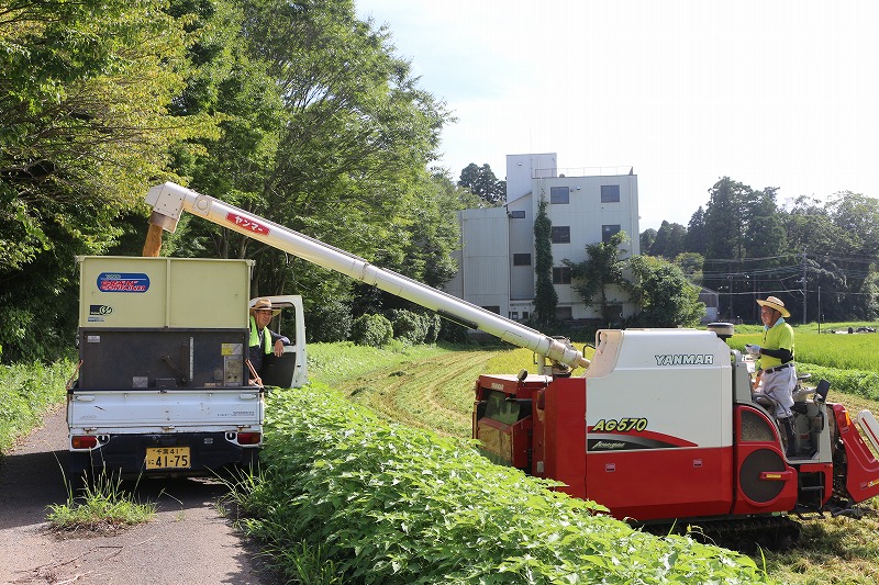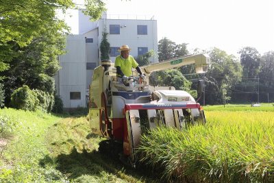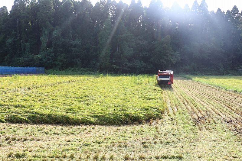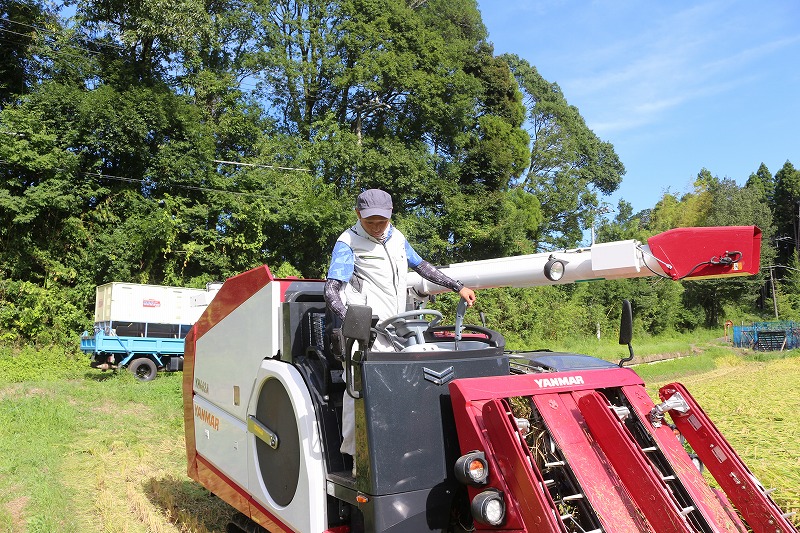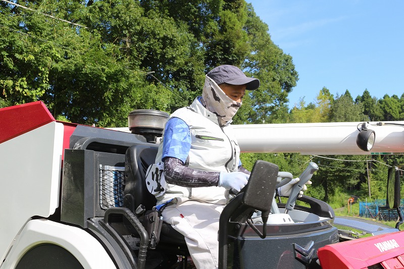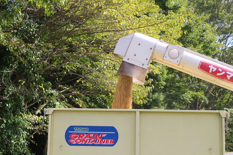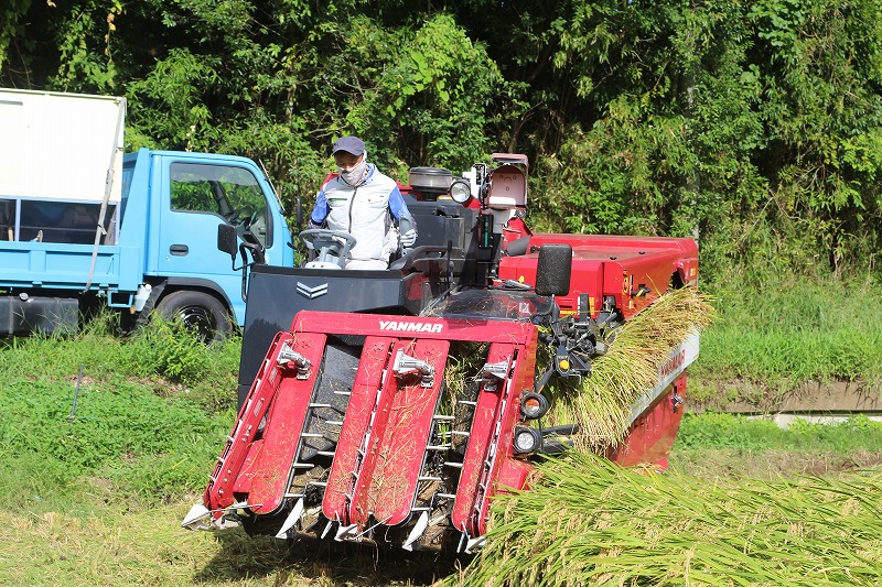 稲刈り作業の様子です。翌日から台風のため、この日はいつもよりも急いで作業を進めていましたが、無事終えることができました。天候が荒れる前の事前準備や日々のスケジュール管理をしっかり行っています。